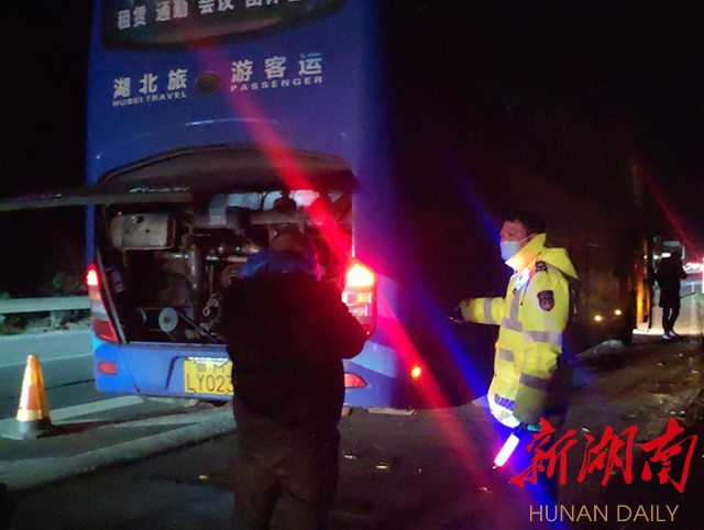 当天凌晨1时许,湖南高速集团怀化分公司芷江管理所响起了急促的电话声:“我的车坏了,车上有很多乘客,请快来帮我!”管理所巡查人员了解了车辆位置等情况后,迅速赶到现场,发现一辆鄂M牌照的大客车停在应急车道,有几位乘客站在车旁闲聊,旁边行车道上不断有车辆呼啸而过,情形十分危急。
