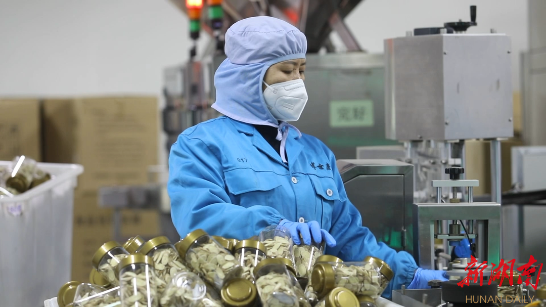 在湖南博世康中医药有限公司生产车间,近60名工人分工协作,生产防疫药品和保健产品。