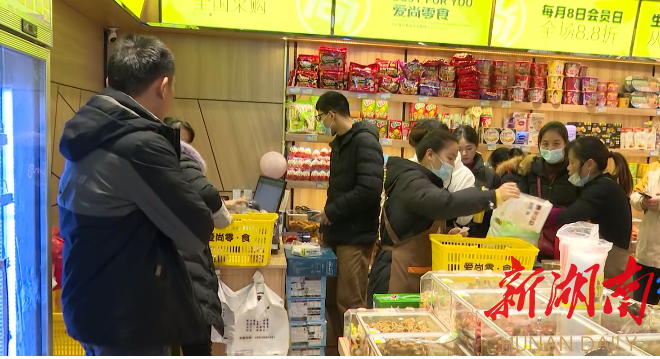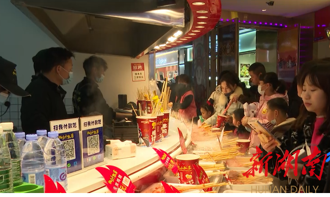 零食店琳琅满目的休闲食品让人目不暇接,吸引了不少顾客采购年货;儿童游乐区抓娃娃、亲子手工制作等项目成为孩子们的乐园。大家购物累了还可到餐饮区补充“能量”,炸串、烤串、奶茶等各种网红小吃散发出诱人的香味,用餐区坐无虚席,大家在享受美食的同时,感受着城市的烟火气息。