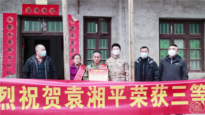 1月11日,邵阳县人武部、邵阳县退役军人事务局组成联合慰问组到吴广广、邓情亮、袁湘平等8位荣立三等功军人家中送去喜报,让军属共享这份荣耀和喜悦。