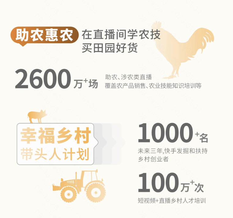 依托于快手持续践行的“幸福乡村战略”,2022年,共计有超2600万场助农、涉农类直播在快手推出,内容覆盖农产品销售、农业技能知识培训等。未来三年,依据“幸福乡村带头人计划”,快手还将发掘和扶持超过 1000 名乡村创业者,开展超过 100 万人次的短视频+直播乡村人才培训。