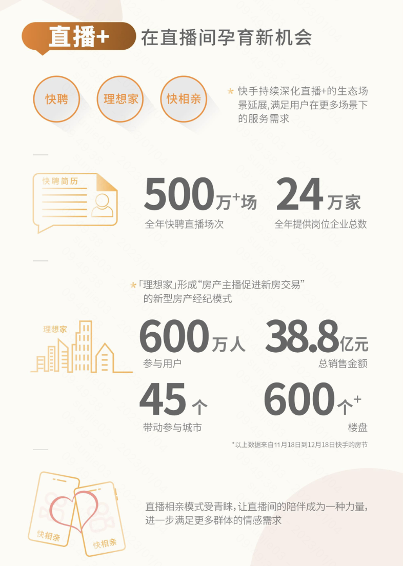 除此之外,带领快手老铁应聘就业、相亲、购房的新型直播,也成为了独属于快手这一数字普惠社区的特色风景。就在不久前举行的「快手购房节」活动中,共计600万用户参与,带动45个城市参与,最终总销售金额达38.8亿元。直播招聘方面,2022全年,快聘直播场次超500万场,提供岗位的企业总数已达24万家。