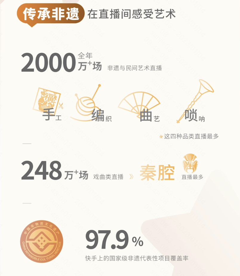 非遗传承方面,2022年,快手已有超2000万场非遗与民间艺术直播,其中手工、编织、曲艺、唢呐等四种品类的直播最多。戏曲类直播在2022年已达248万场,其中秦腔直播最多。截至2021年10月,快手上的国家级非遗代表性项目覆盖率已达到97.9%。