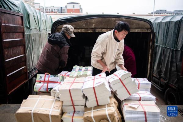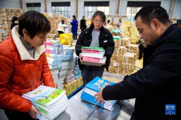 2月4日,在祁阳市新华书店教材中转库,工作人员在分发教材。