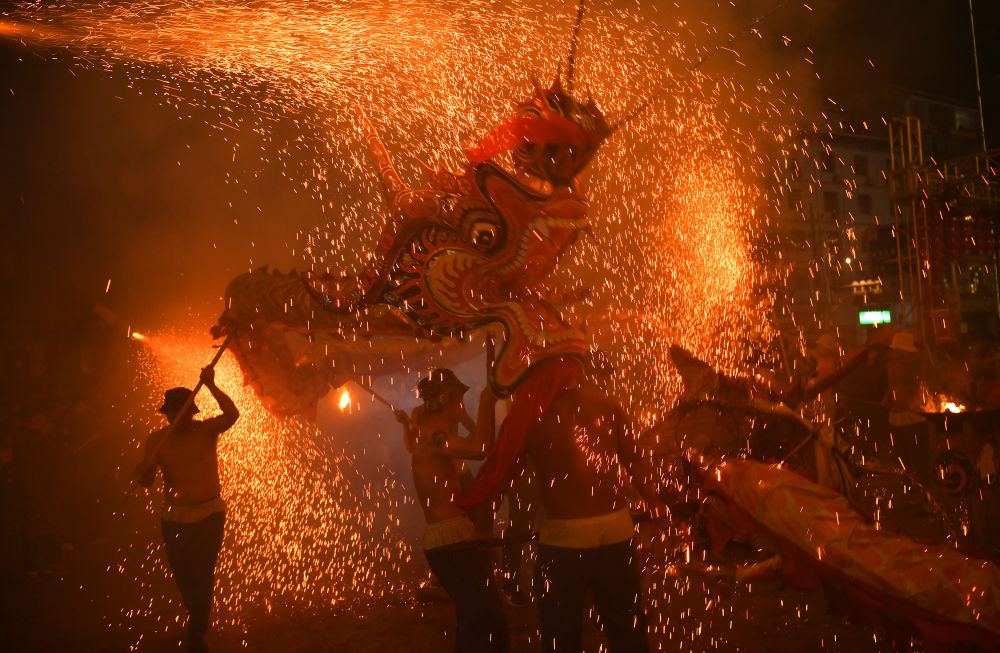 2月4日,在湖南省湘西土家族苗族自治州保靖县宏一蓝泊湾广场,民间艺人表演钢火烧龙。新华社发 (龙恩泽 摄)