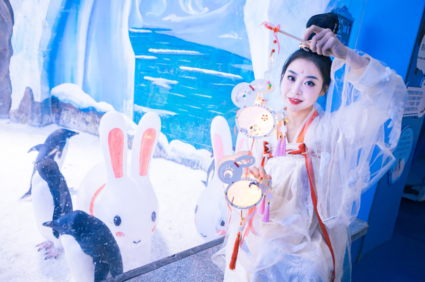 海洋动物们也有属于自己的过节仪式感。冰山北极馆的北极熊又将迎来特色元宵大餐,身着汉服的幸运游客将从馅料、面团做起,为北极熊制作巨型古代八宝元宵。南极企鹅馆的企鹅们也将在兔年元宵,与兔子展开一场“萌趣邂逅”。游客可身着传统汉服参与白膜兔子灯的DIY彩绘,亲手绘制自己心中最可爱的新年小兔子。