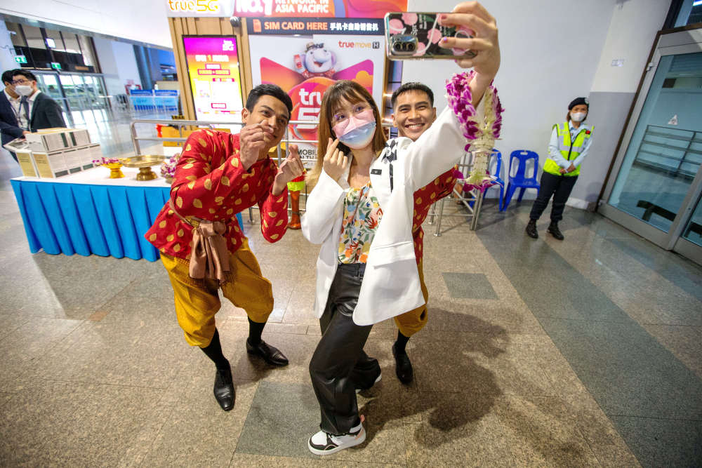 ↑2月6日,在泰国曼谷廊曼国际机场,一名中国游客与工作人员自拍。新华社记者 王腾 摄