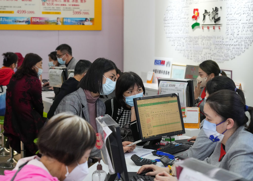 ↑2月8日,消费者在中国广州广之旅国际旅行社销售网点咨询。新华社记者 刘大伟 摄