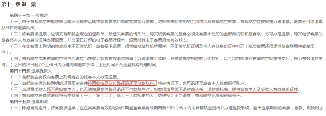 采访过程中,记者查询了国内多家航空公司的退票规定。从字面意义理解,航空公司普遍允许退票款“原路返回”,即退到原付款人账户。如首都航空规定“首都航空优先按列明的退票限制条件将票款按原支付路径退款至付款账户”“当退票受款人既不是旅客本人,也无法按原支付路径退还至付款账户时,旅客需填写线下退款确认书、退款委托书、提供旅客本人及收款人有效身份证明”。