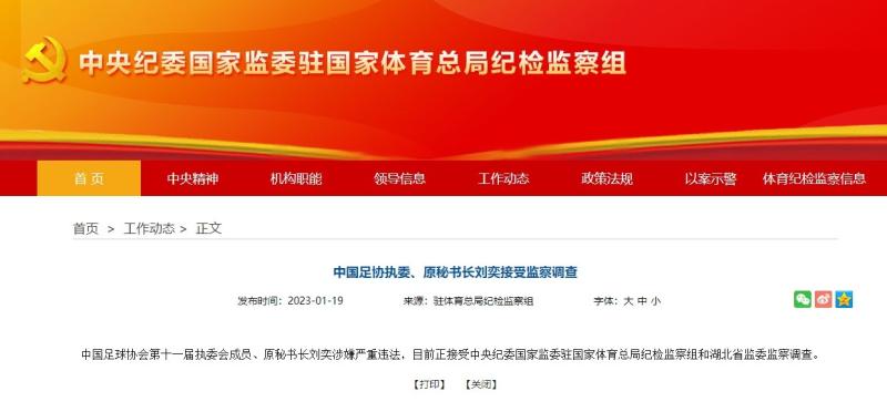 2023年1月19日,据驻体育总局纪检监察组消息,中国足球协会第十一届执委会成员、原秘书长刘奕,常务副秘书长兼国家队管理部部长陈永亮涉嫌严重违法,目前正接受中央纪委国家监委驻国家体育总局纪检监察组和湖北省监委监察调查。