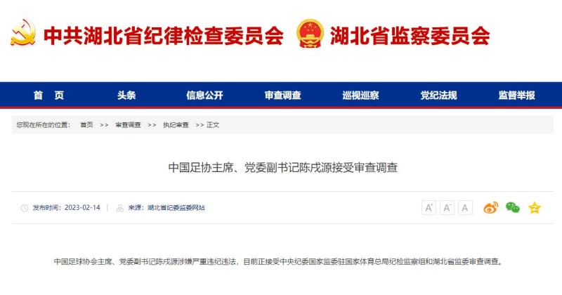 2月14日,湖北省纪委监委、国家体育总局网站发布信息:中国足球协会主席、党委副书记陈戌源涉嫌严重违纪违法,目前正接受中央纪委国家监委驻国家体育总局纪检监察组和湖北省监委审查调查。