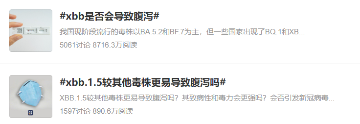 此前,#XBB是否会导致腹泻#、#xbb.1.5较其他毒株更易导致腹泻吗#的话题双双冲上微博热搜,XBB病毒真的是传闻中的“拉肚株”吗?