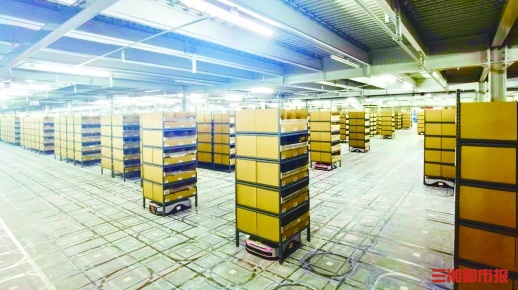 (京东物流长沙“亚洲一号”智能物流园区内,百余台应用5G技术的“地狼”AGV智能拣选机器人已投用。 受访者 供图)