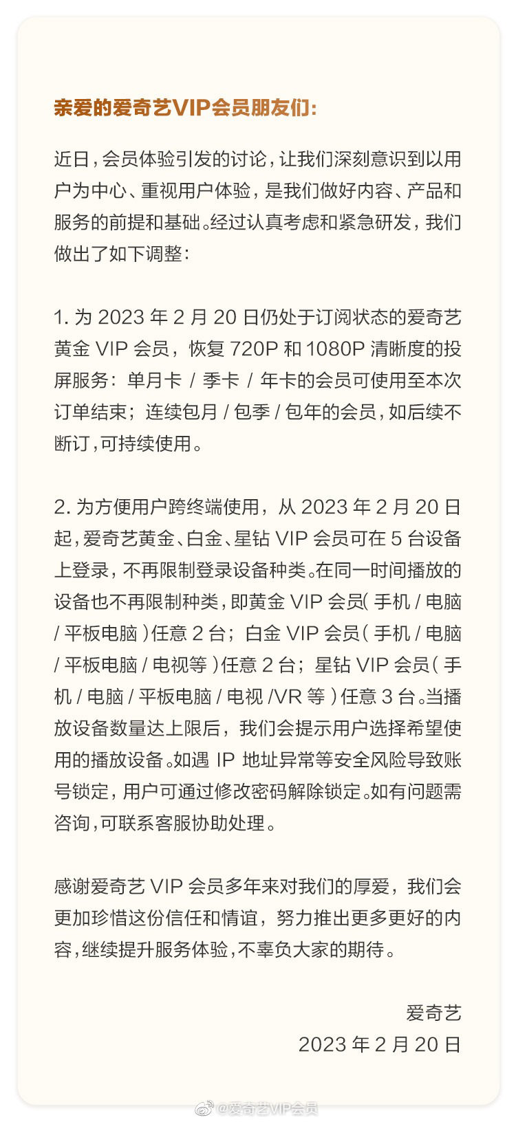 刚刚,爱奇艺通过官方微博发布关于爱奇艺会员服务优化情况说明。
