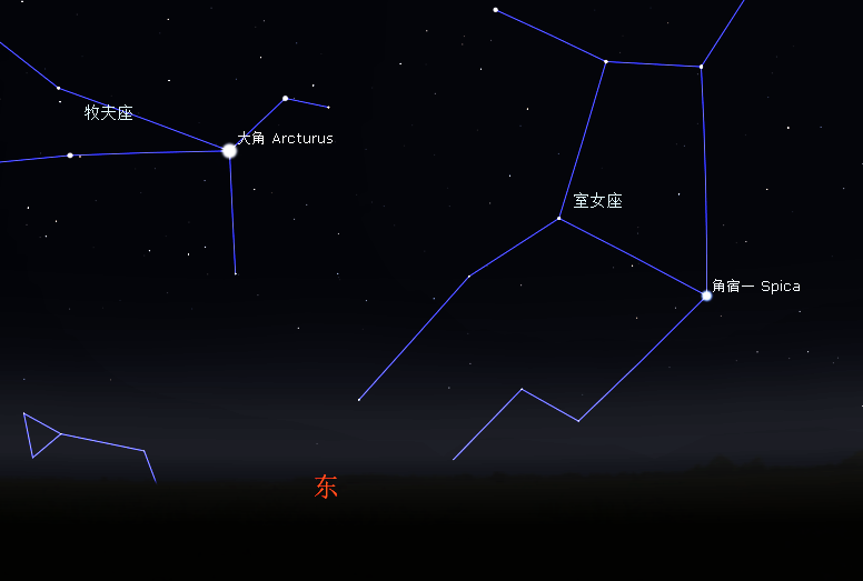 △2月21日傍晚,角宿一、大角相对位置示意图 图源:北京天文馆