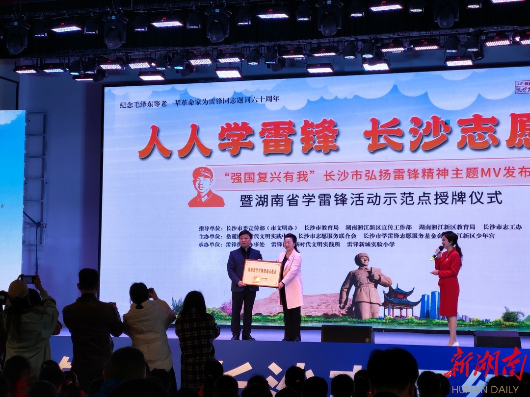 湖南日报•新湖南客户端2月20日讯(记者 王晗)“请党放心,强国有我!”今天下午,作为长沙市学雷锋志愿服务文化节主题活动之一,“强国复兴有我”长沙市弘扬雷锋精神主题 MV 发布暨湖南省学雷锋活动示范点授牌仪式在湖南湘江新区雷锋新城实验小学举行,孩子们嘹亮的宣言响彻会场。
