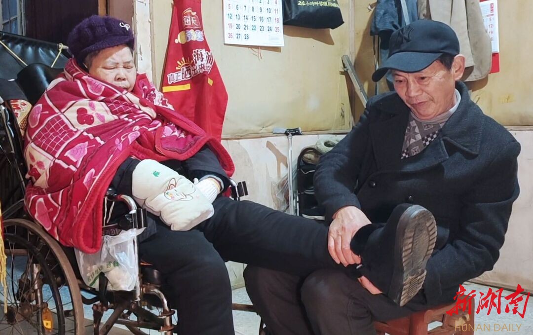2月13日,初春的阴雨天,长沙市望城区大泽湖街道南塘村一间民房内,73岁的刘德元小心翼翼地扶着老伴叶友春起床。