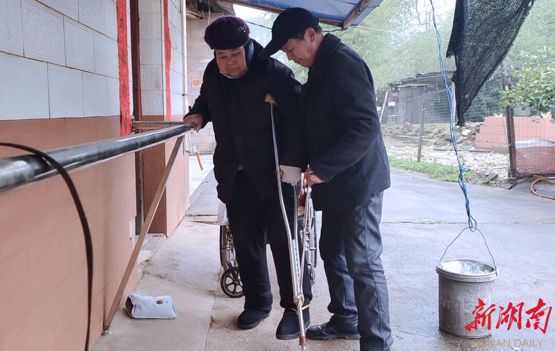 刘德元还自制了康复工具“马镫子”,将铁丝做成圆环套在老伴脚踝上,再用细绳将圆环系到拐杖上,用臂力帮助老伴抬脚走动,进行康复锻炼。怕老伴摔跤,他还请人在屋外禾场焊上一排不锈钢扶手。