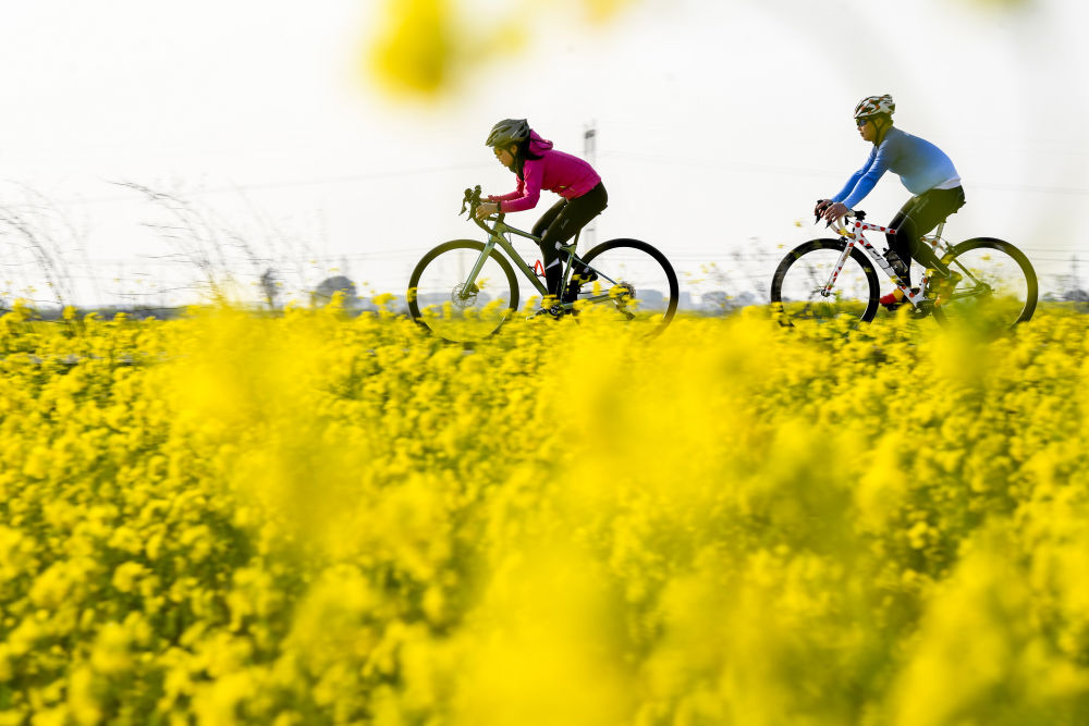 图为2月21日,骑行爱好者在江西省樟树市永泰镇官湖村油菜花海中骑行、赏花。(周亮 摄)