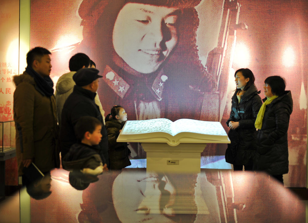 2012年2月18日,湖南长沙雷锋纪念馆母女讲解员谭荒芳(右一)和张璐琪(右二)在给参观者讲解。新华社记者 白禹 摄