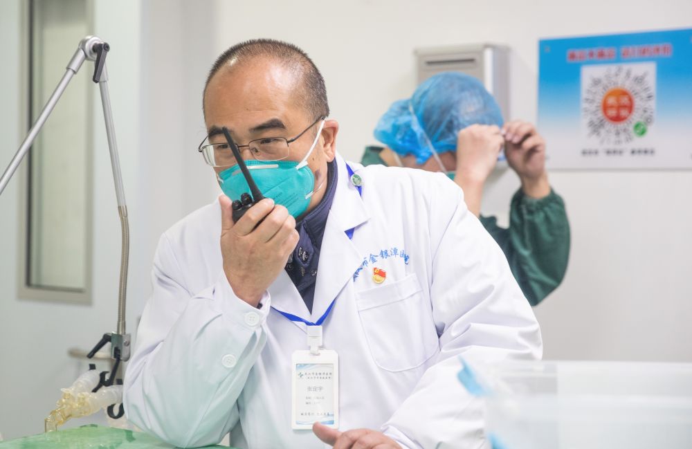 2020年1月27日,时任武汉金银潭医院院长的张定宇在医院综合病区楼联系、协调工作。新华社发(柯皓 摄)