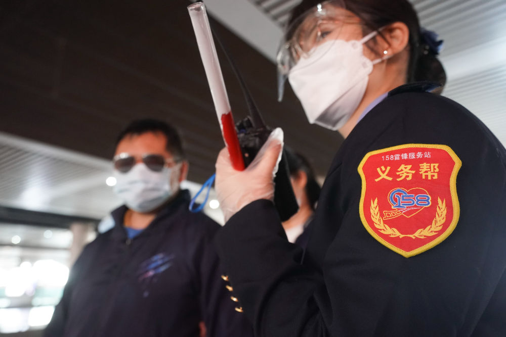 2022年3月7日,在南京南站,“158”雷锋服务站工作人员顾娟陪着盲人旅客等待火车进站。新华社记者 季春鹏 摄