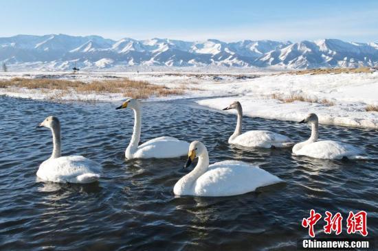 新疆巴里坤天鹅与雪山同框构成唯美生态景观画