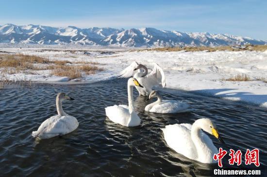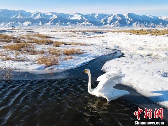 天鹅与远处皑皑的雪山同框,构成了一幅唯美的生态景观画。