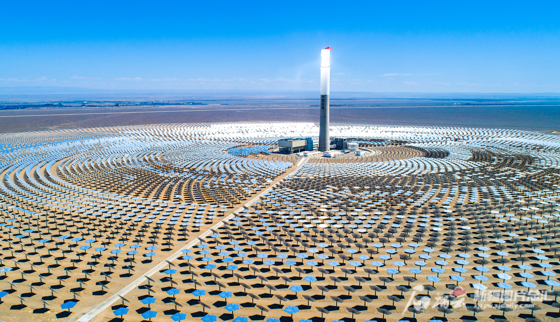 位于哈密市伊吾工业园区的中电哈密太阳能热发电有限公司哈密50兆瓦熔盐塔式光热发电站全景(资料图)。李华摄