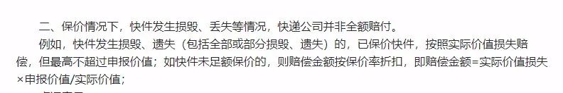 “快件发生损毁、遗失(包括全部或部分损毁、遗失)的,已保价快件,按照实际价值损失赔偿,但最高不超过申报价值;如快件未足额保价的,则赔偿金额按保价率折扣,即赔偿金额=实际价值损失×申报价值/实际价值。”