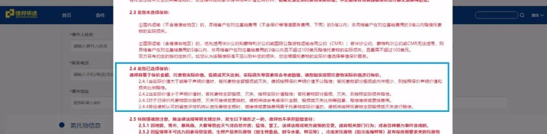 “若您已选择保价且支付保价费用的,则破损、短少时快递服务组织将按照保价金额和实际损失的比例向您赔偿,托寄物灭失时最高不超过您托寄时保价的声明价值。声明价值:鉴于快递服务组织无法评估托寄物的实际价值,当托寄物价值超过人民币1000元时,您应当在寄件时向快递服务组织如实声明;如您未声明且未保价,视为价值不超过1000元。”