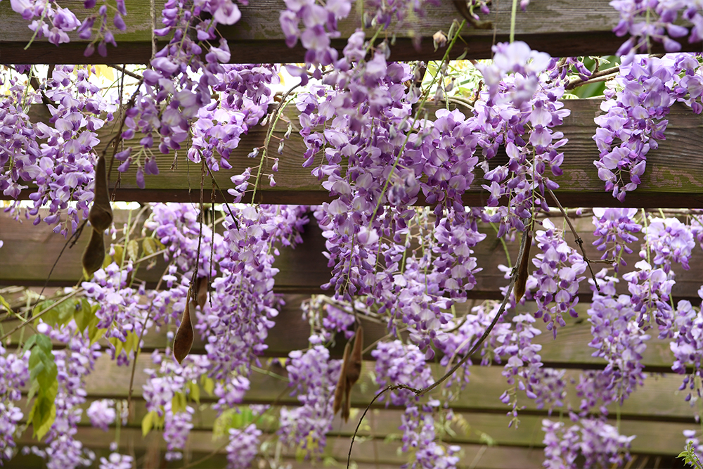 紫藤园内,绿叶藤蔓,串串紫花随风摇曳。这里的紫藤全部来自日本,花穗长达80至100厘米,而国内紫藤花穗只有30厘米左右。紫藤园共有9个品种,是国内品种最多的紫藤园。