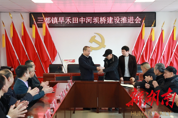 湖南日报·新湖南客户端2月13日讯(通讯员 钟杰 曾志明)“这里是10万元现金,是我们‘湾村明白人’发动乡贤群众捐的修桥款,请修桥理事会清点查收。”在2月12日召开的中和坝桥建设推进会上,耒阳市三都镇早禾田村下新湾“湾村明白人”张赛华将修桥款交到了修桥理事会会计手上。