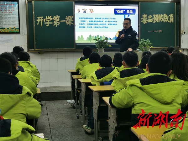 △禁毒民警给蒸湘区实验小学学生上毒品预防教育第一课