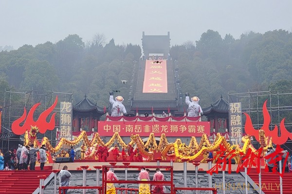 2月5日上午,在濛濛细雨中,衡南“七巧龙”队、南岳“寿龙”队、祁东“三官骨牌灯龙”队、衡山“席草龙”队、东岳木狮队等十余支龙狮队伍接连登台,竞技争霸。双龙下海、龙腾云、龙穿门、瑞狮出洞、登山、飞跃山涧等,表演者们动作敏捷,变化巧妙,以缠,绕,跳,穿等动作,生动展现龙狮的喜、疑、惊、怕等各种神态。