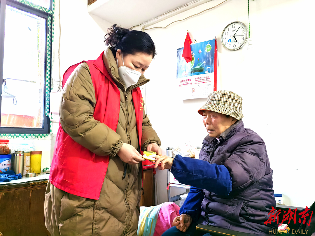 家住淮川街道北园社区西湖山小区的柳娭毑今年88岁,作为独居高龄老人,社区党总支和小区党支部特别关注。彭小平是北园社区西湖山小区的“小桔灯”党员志愿者,她主动担任柳娭毑的“爱心门铃”守护人。