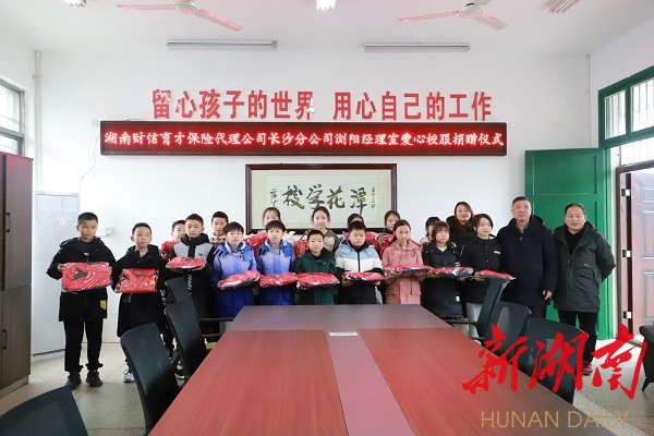 高坪镇潭花完全小学、冷水塘完全小学、兰花园教学点位于偏远的乡村,学生大部分都是留守儿童。浏阳市教育局关工委了解到这一情况后,联合湖南财信育才保险代理公司长沙分公司浏阳经理室的爱心人士奔赴高坪镇,为3所学校的学生现场捐赠价值2.5万元的校服280套,实现了孩子们的“校服梦”。