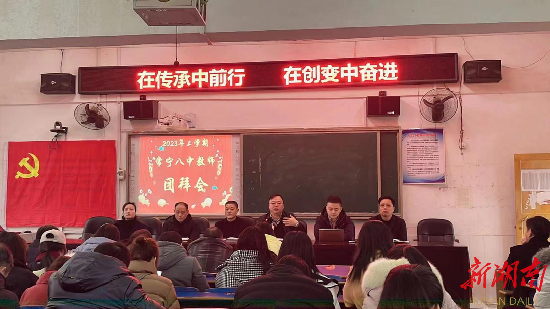 新湖南客户端2月7日讯(吴洪江通讯员:郑智明易秋艳)近日,常宁市第八中学全体教师齐聚大会议室,热烈召开“在传承中前行 在创变中奋进 ”2023年新春团拜会暨开学工作会议。会议由党总支书记廖湘钢主持,出席本次会议的有文津教育集团领导祁有凯,长沙岳麓区博致学校校长吴雨潞等一行人。