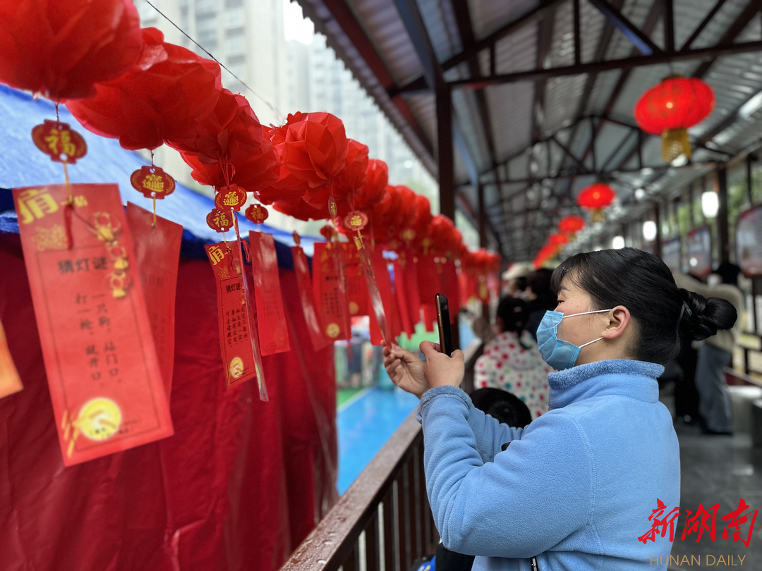 在猜谜语活动区域,工作人员将精心挑选的500条融知识性、趣味性为一体的经典谜语,悬挂在洋湖景园文化长廊下供大家竞猜。五颜六色、各式各样的灯谜吸引了许多居民群众。辖区居民三五成群,热烈讨论着谜面、思索着谜底,你一条我一条,兴致极高,互相交流,猜中后大家怀着喜悦的心情在兑奖处排队领取小礼品。谜语形式生动活泼,面广而量大,奖品丰富多样。居民们积极参与,现场洋溢着喜庆的节日气氛。