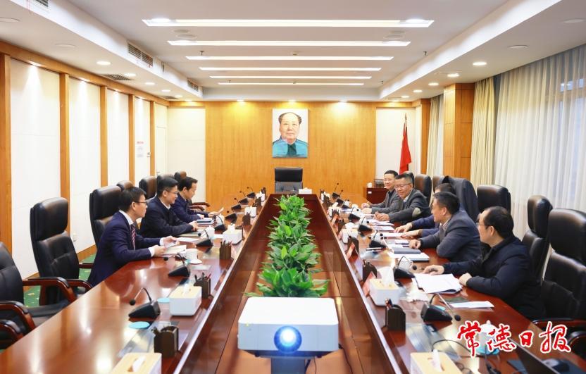 2月23日,常德市委书记曹志强与来常考察的海捷控股集团有限公司董事长储慧斌一行座谈,双方就项目合作、产业园建设等事宜进行洽谈交流。