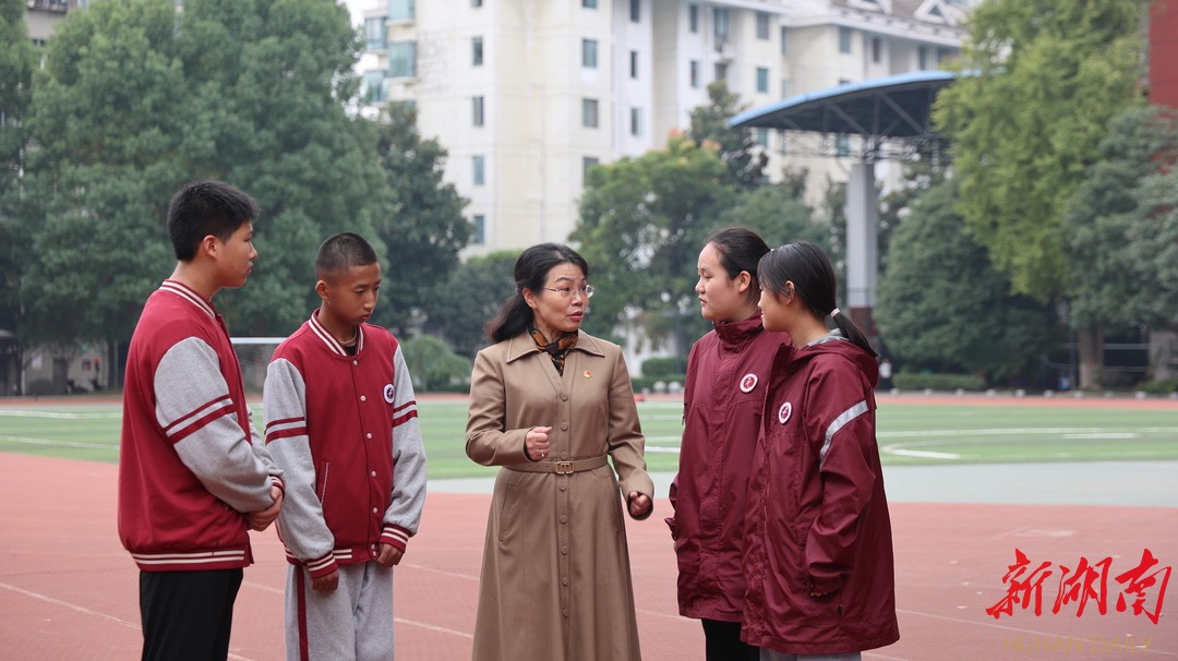 (党的二十大代表、常德市四中党总支书记、校长朱金凤和孩子们交谈。刘蓉摄)