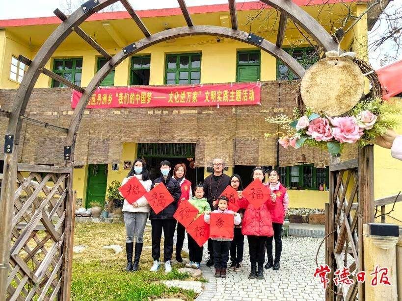 (武陵区丹洲乡“艺丹沅”文艺部落,常德市书法家协会会员与孩子们书写福字并合影。通讯员 杨丽萍 摄)
