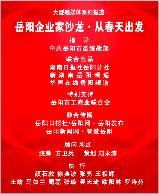 在中共岳阳市委统战部指导下,湖南日报社岳阳分社、新湖南客户端岳阳频道、华声在线岳阳频道聚焦本期岳阳企业家沙龙,精心策划推出系列报道,敬请关注!