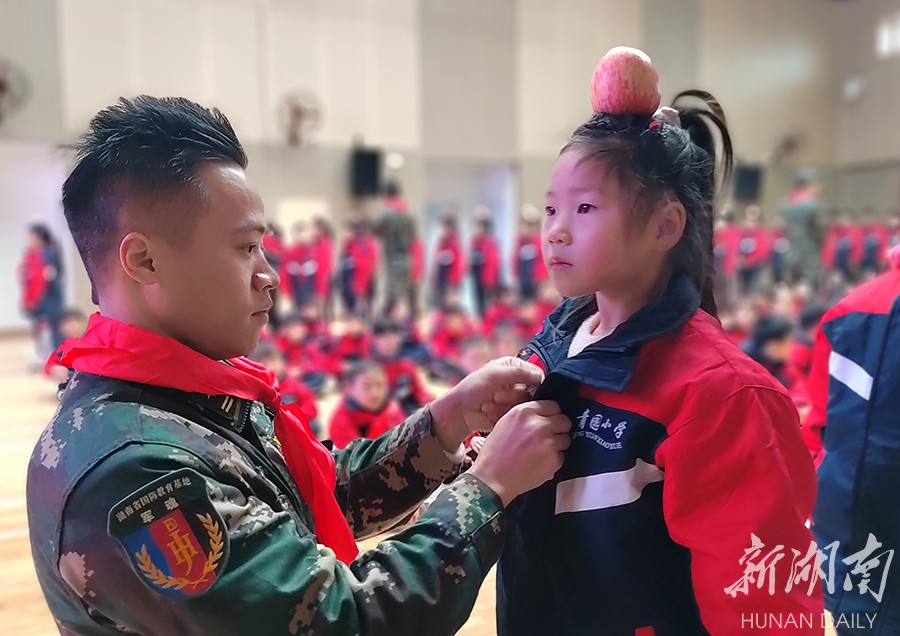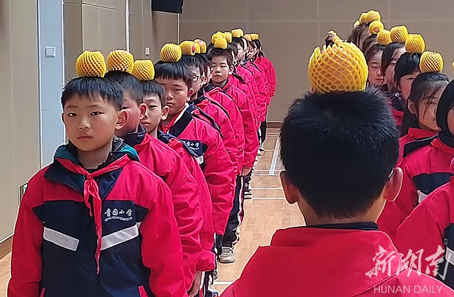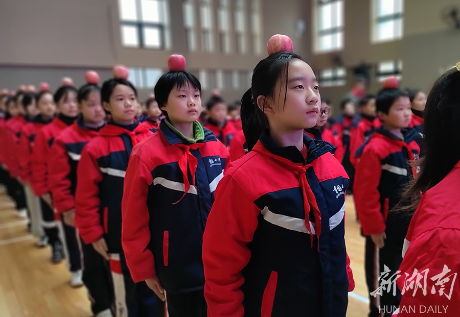 2月8日,长沙天心区青园许兴小学,学生以饱满的热情投入军训。在教官的指导下,同学们头顶苹果站军姿,磨练意志,锻炼体魄。湖南日报全媒体记者 徐行 通讯员 王国光 摄影报道