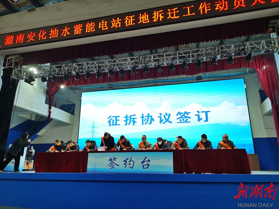 湖南日报·新湖南客户端2月8日讯(记者 杨军 通讯员 周云峰 曾一鸣)2月8日,安化县召开安化抽水蓄能电站征地拆迁工作动员大会,仙溪镇芙蓉村、龙丰村的30户居民现场签订协议书,被授予“支持项目建设示范户”。