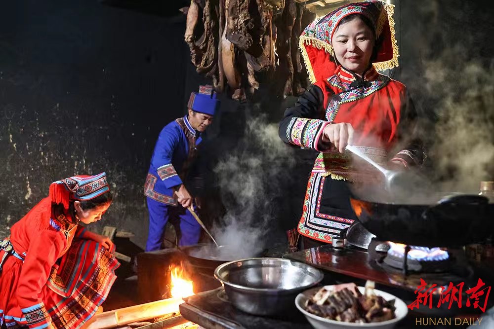 △村民为游客烹饪山里美食,让游客感受舌尖上的瑶乡饮食文化