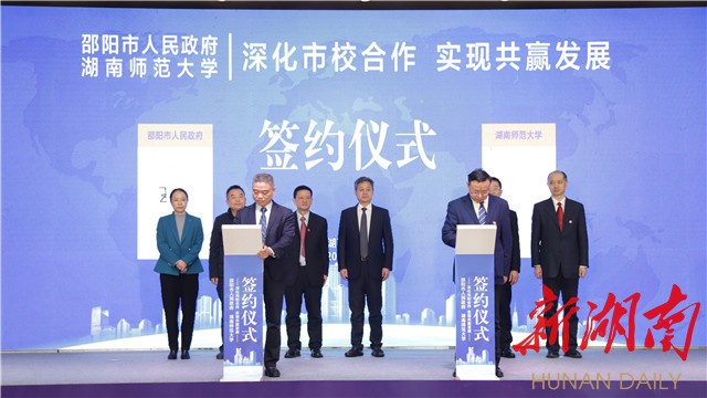 湖南日报·新湖南客户端2月28日讯(通讯员 杨立军)2月27日下午,邵阳市人民政府与湖南师范大学签订战略合作框架协议。这是双方开展“深化市校合作 实现共赢发展”活动取得的重大成果,将推动双方实现互利共赢发展,共同打造全省市校合作新典范。市委书记严华,湖南师范大学党委书记、欧洲科学院院士蒋洪新见证签约并致辞。