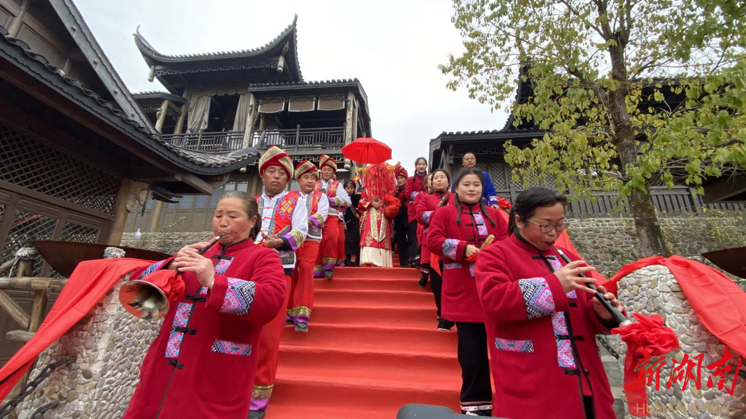 当天上午8时许,一支背竹篓、挑箩筐、抬花轿的浩荡迎亲队伍,在土家族传统乐队欢快喜庆的敲打吹奏声中,穿过古香古色的村寨,走过长长的凉亭桥,到达惹巴拉王宫。