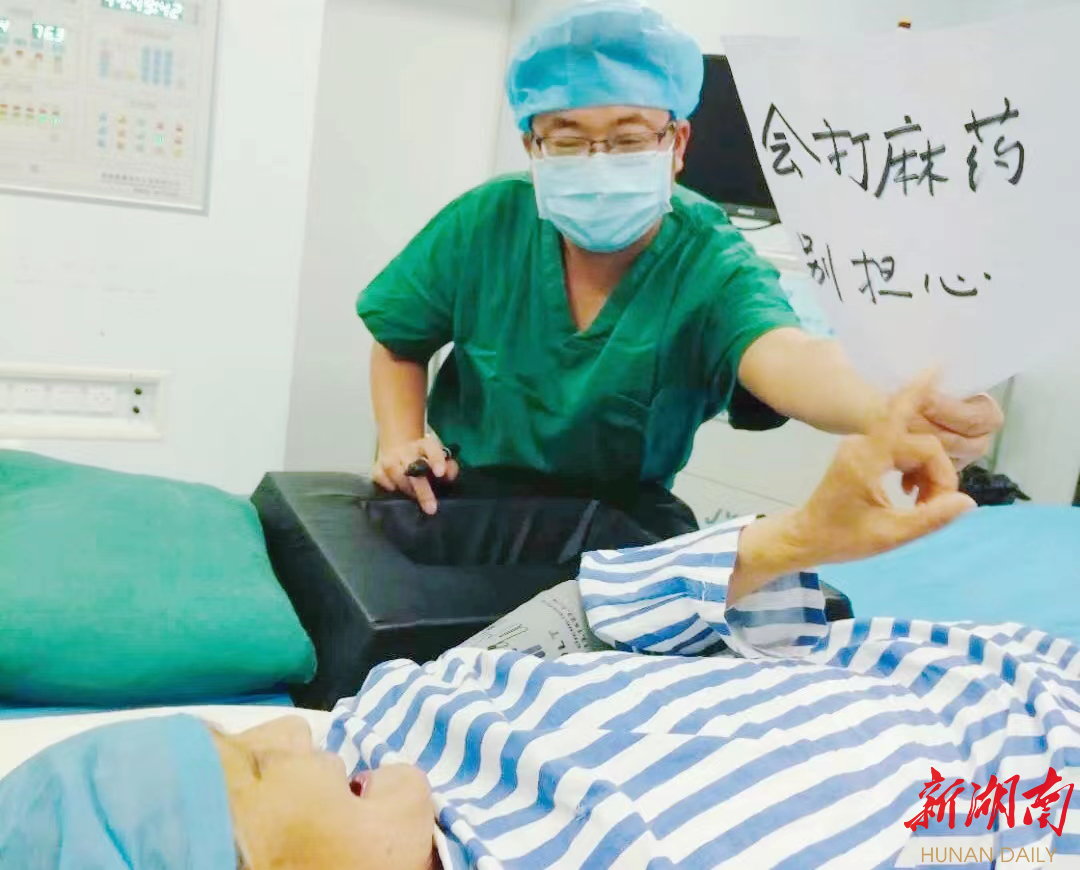保靖县中医院副院长、省中医重点专科骨伤科主任向功宝用写字板和聋哑患者进行术前交流