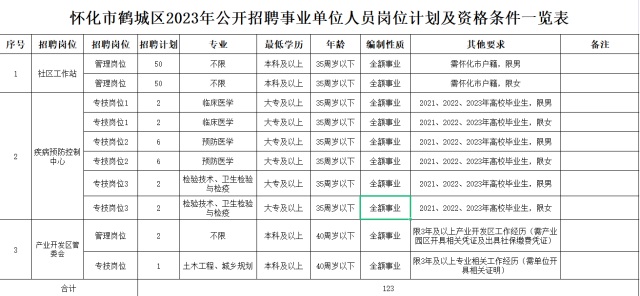 计划招聘事业单位工作人员123名,其中社区工作人员100名、疾控中心工作人员20名、产业开发区管理委员会工作人员3名。各招聘单位具体招聘计划、岗位、资格条件等详见《怀化市鹤城区2023年公开招聘事业单位工作人员岗位计划及资格条件一览表》(见附件1)。